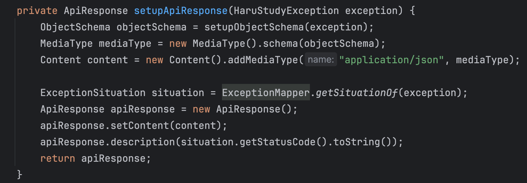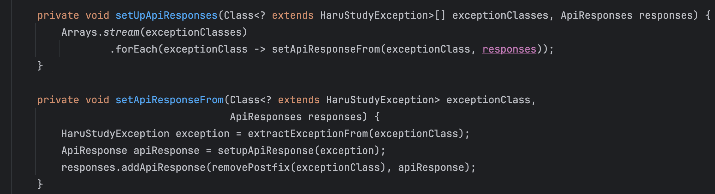 setUpApiResponses 메서드에서는 각 예외 클래스마다 응답들로 ApiResponse를 생성해서 ApiResponses에 추가하도록 했습니다.