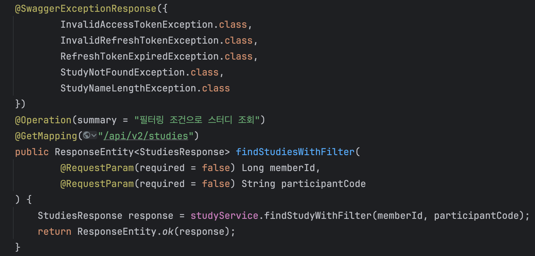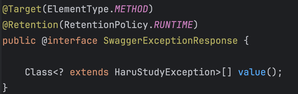 먼저, SwaggerExceptionResponse라는 스웨거의 예외 응답 전용 커스텀 어노테이션을 만들었습니다.