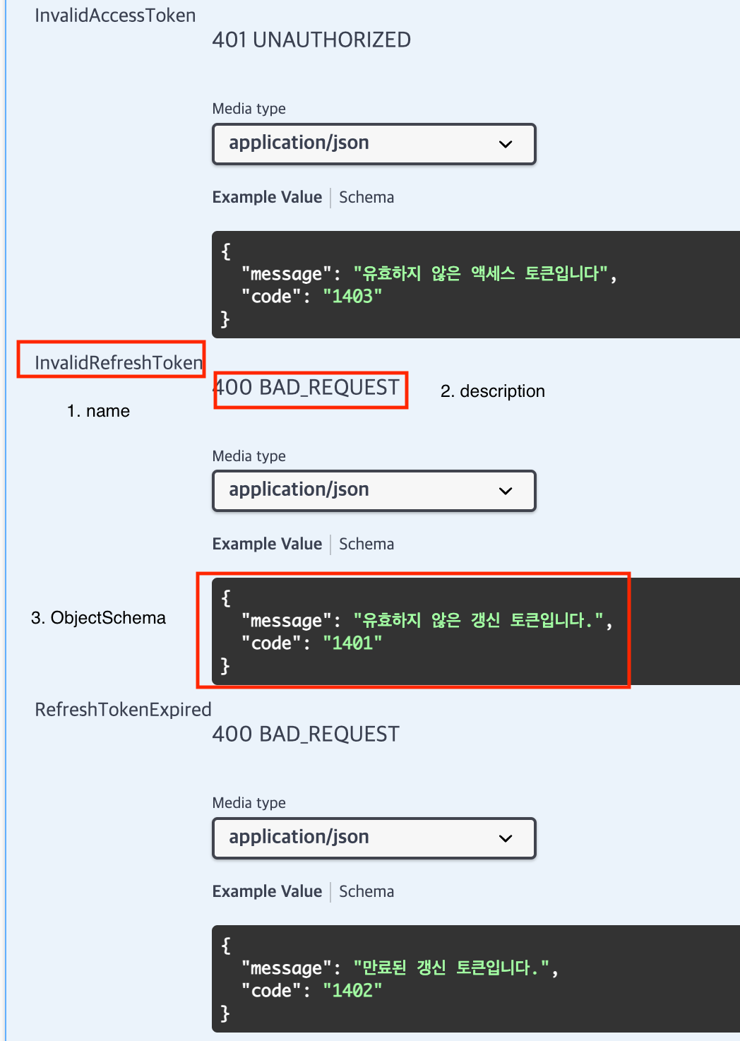 정상적인 케이스의 응답 형태뿐만 아니라 예외 관련 응답도 명세할 필요가 있었습니다.